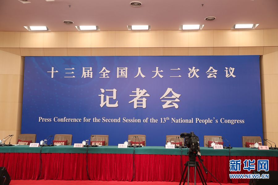 十三屆全國人大二次會議新聞中心3月9日在梅地亞中心新聞發布廳舉行記者會,邀請全國人大農業與農村委員會主任委員陳錫文、全國人大財政經濟委員會副主任委員烏日圖、全國人大常委會法制工作委員會副主任劉俊臣、全國人大常委會法制工作委員會副主任許安標、全國人大環境與資源保護委員會委員程立峰就“人大立法工作”相關問題回答記者提問。圖為記者會現場。新華網/中國政府網 陳杰 攝