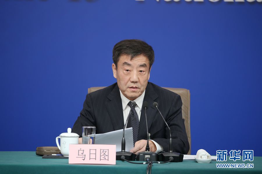 十三屆全國人大二次會議新聞中心3月9日在梅地亞中心新聞發布廳舉行記者會,邀請全國人大農業與農村委員會主任委員陳錫文、全國人大財政經濟委員會副主任委員烏日圖、全國人大常委會法制工作委員會副主任劉俊臣、全國人大常委會法制工作委員會副主任許安標、全國人大環境與資源保護委員會委員程立峰就“人大立法工作”相關問題回答記者提問。圖為全國人大財政經濟委員會副主任委員烏日圖。新華網/中國政府網 劉廈 攝