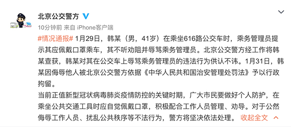 1月31日,韓某因侮辱他人被北京公交警方依據(jù)《中華人民共和國治安管理處罰法》予以行政拘留。當(dāng)前正值新型冠狀病毒肺炎疫情防控的關(guān)鍵時(shí)期,廣大市民要做好個(gè)人防護(hù),在乘坐公共交通工具時(shí)應(yīng)自覺佩戴口罩,積極配合工作人員管理、勸導(dǎo)。對于公然侮辱工作人員、擾亂公共秩序等不法行為,警方將堅(jiān)決依法處理。