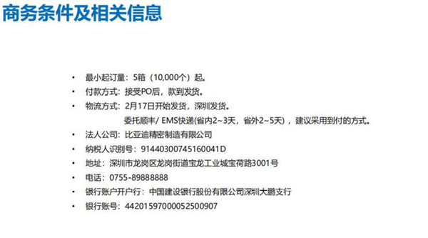 與此同時(shí),《比亞迪賣口罩了》pdf文件也在網(wǎng)上流傳,文件內(nèi)容顯示,口罩制造的法人公司為比亞迪精密制造有限公司,最小起訂量為5箱(10000個(gè))起,2月17日開始從深圳發(fā)貨。快遞委托順豐/ EMS快遞(省內(nèi)2-3天,省外2-5天) 。