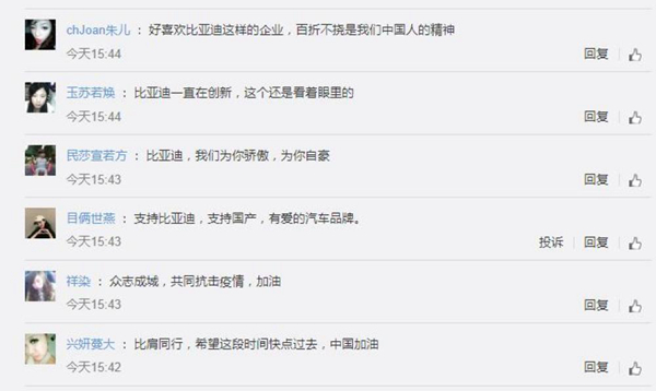 對(duì)于比亞迪汽車跨界造口罩一事,網(wǎng)友紛紛表示:“眾志成城,共同抗擊疫情”“百折不撓是中國(guó)人的精神”“希望這段時(shí)間快點(diǎn)過去,中國(guó)加油”。