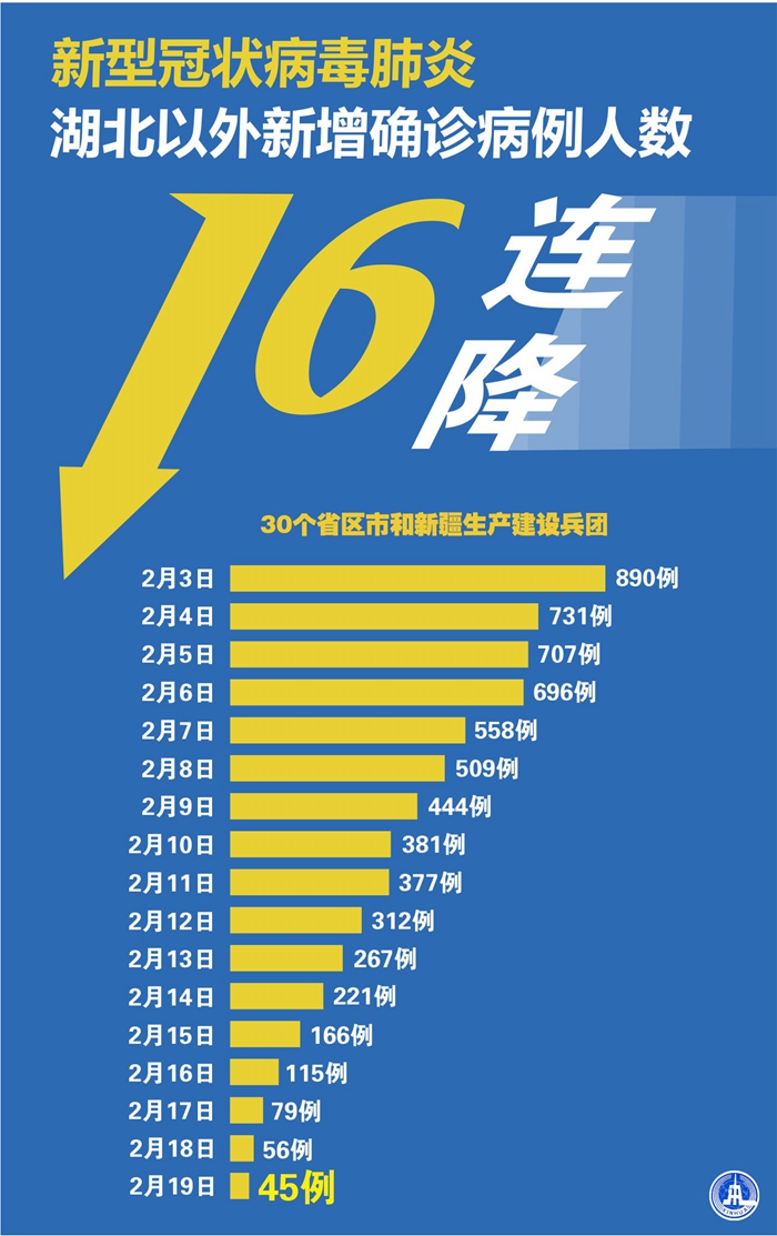 截至2月19日24時(shí),據(jù)31個(gè)省(自治區(qū)、直轄市)和新疆生產(chǎn)建設(shè)兵團(tuán)報(bào)告,現(xiàn)有確診病例56303例(其中重癥病例11864例),累計(jì)治愈出院病例16155例,累計(jì)死亡病例2118例,累計(jì)報(bào)告確診病例74576例(江西、河南、云南省各核減1例),現(xiàn)有疑似病例4922例。累計(jì)追蹤到密切接觸者589163人,尚在醫(yī)學(xué)觀察的密切接觸者126363人。