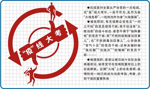 這次抗擊新冠肺炎疫情,是對全面從嚴(yán)治黨的一次檢閱,是領(lǐng)導(dǎo)干部政治素質(zhì)、宗旨意識、全局觀念、駕馭能力、擔(dān)當(dāng)精神的試金石、磨刀石。基層是執(zhí)政之基。“能者上、庸者下、劣者汰”,近期“火線”上的任免表明,疫情防控一線已經(jīng)成為當(dāng)前考驗(yàn)、考察、識別干部的重要陣地。(案例來源:新華社、中央紀(jì)委國家監(jiān)委網(wǎng)站、中國紀(jì)檢監(jiān)察報、湖北日報等 記者黃海波、劉婧宇)