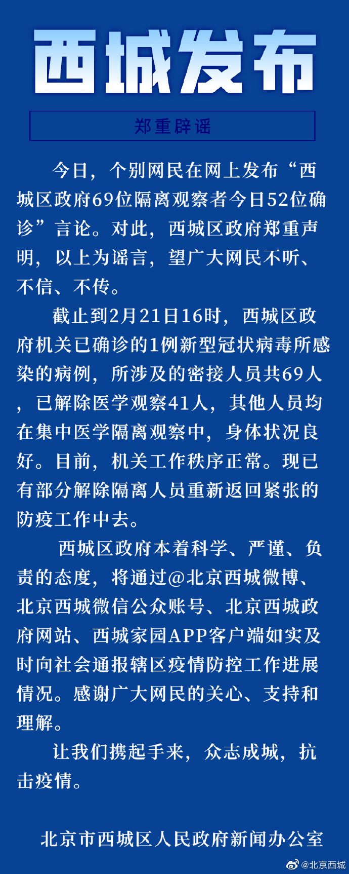 【鄭重辟謠:西城區政府69位隔離觀察者今日52位確診系謠言】望廣大網民不聽、不信、不傳,讓我們攜起手來,眾志成城,抗擊疫情。