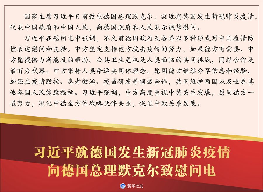 習近平在慰問電中強調,不久前德國政府及各界以多種形式對中國疫情防控表達慰問和支持。中方堅定支持德方抗擊疫情的努力,如果德方有需要,中方愿提供力所能及的幫助。公共衛生危機是人類面臨的共同挑戰,團結合作是最有力武器。中方秉持人類命運共同體理念,愿同德方繼續分享信息和經驗,加強在疫情防控、患者救治、疫苗研發等領域合作,共同維護兩國以及世界其他各國人民健康福祉。習近平強調,中方高度重視中德關系發展,愿同德方一道努力,深化中德全方位戰略伙伴關系,促進中歐關系發展。