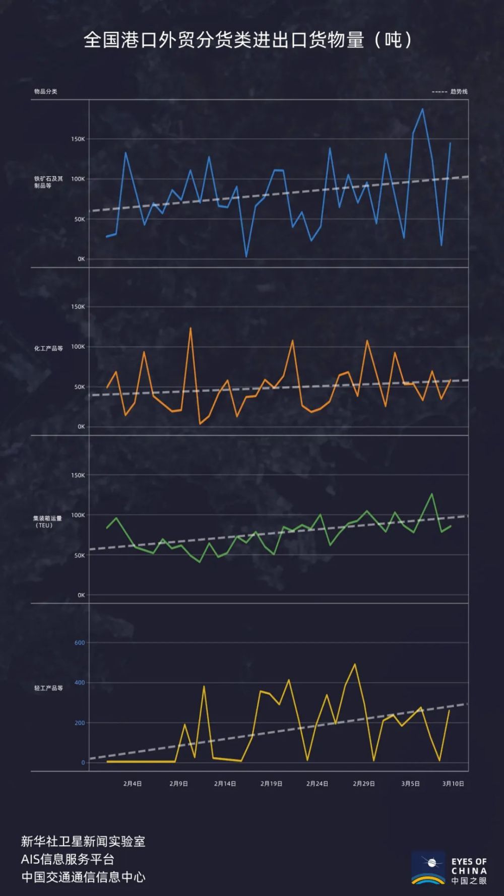 中國(guó)主要出口貨物種類的總量大多在回升,鐵礦石及其制品、化工產(chǎn)品以及輕工產(chǎn)品等的進(jìn)出口量增加更為明顯。