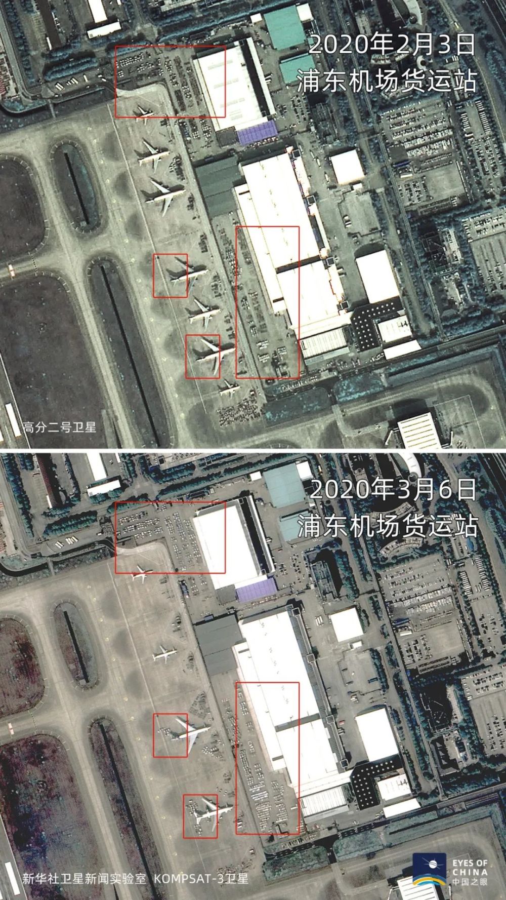 浦東機(jī)場(chǎng)貨運(yùn)站,2月3日多架停放在地面的飛機(jī)裝卸貨物跡象不明顯。3月6日,地面停放飛機(jī)數(shù)量減少,且多在進(jìn)行裝卸作業(yè),堆放的貨物也大大增多。