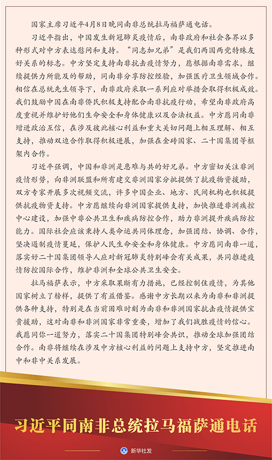 新華社北京4月8日電 國家主席習近平8日晚同南非總統拉馬福薩通電話。