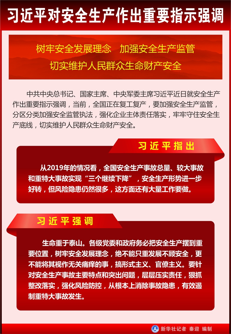 習近平強調,生命重于泰山。各級黨委和政府務必把安全生產擺到重要位置,樹牢安全發展理念,絕不能只重發展不顧安全,更不能將其視作無關痛癢的事,搞形式主義、官僚主義。要針對安全生產事故主要特點和突出問題,層層壓實責任,狠抓整改落實,強化風險防控,從根本上消除事故隱患,有效遏制重特大事故發生。