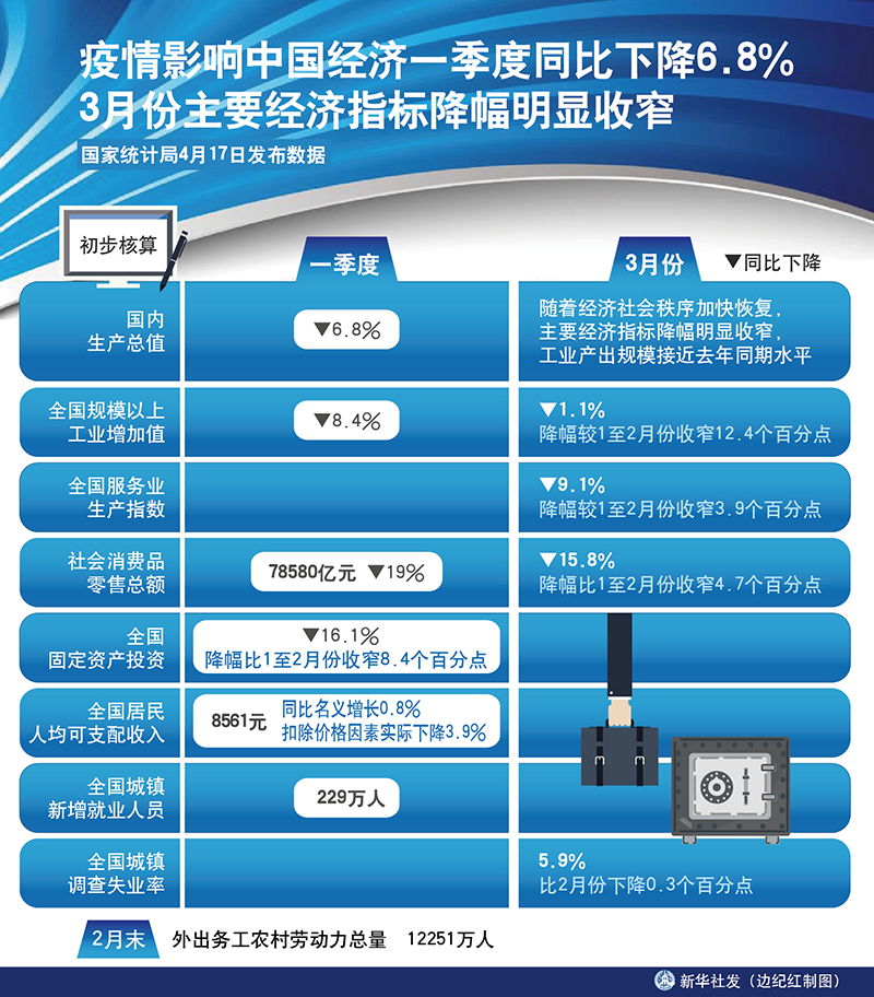 新華社北京4月17日電(記者陳煒偉、安蓓)國家統(tǒng)計局17日發(fā)布數(shù)據(jù),初步核算,一季度國內(nèi)生產(chǎn)總值同比下降6.8%。3月份,隨著經(jīng)濟(jì)社會秩序加快恢復(fù),主要經(jīng)濟(jì)指標(biāo)降幅明顯收窄,工業(yè)產(chǎn)出規(guī)模接近去年同期水平。