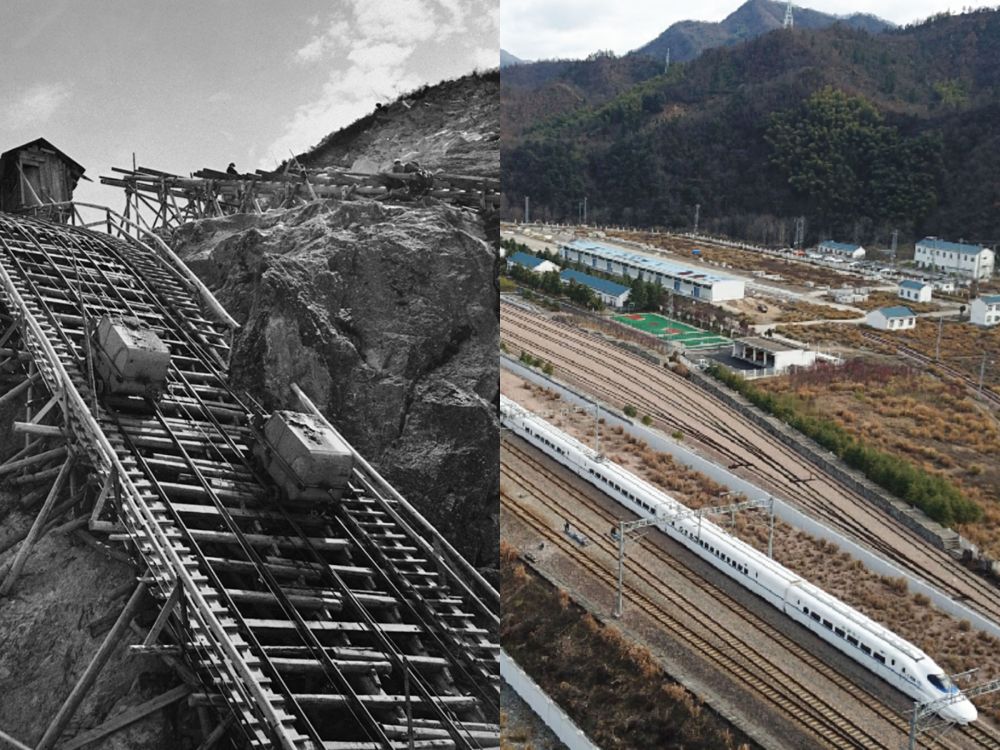 (左圖:1957年金寨響洪甸水庫(kù)工地上吊車運(yùn)送混凝土,新華社稿王永嘉攝;右圖:2019年高鐵駛出金寨火車站。新華社記者張端攝)