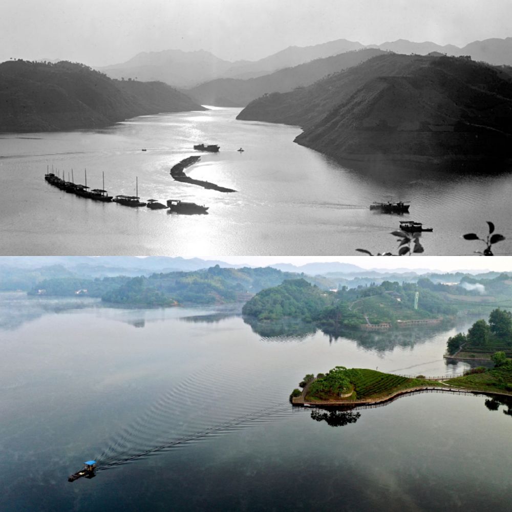 (上圖:1976年金寨的水庫(kù),新華社記者成大林?jǐn)z;下圖:2019年水庫(kù)之上是茶谷。新華社記者陶明攝)