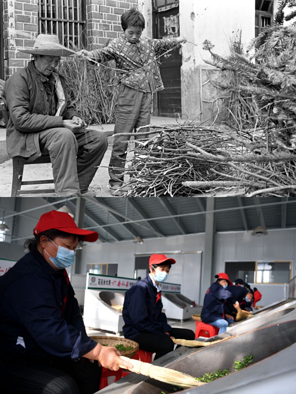 (上圖:過(guò)去金寨人守著柴火過(guò)日子,新華社記者張曙光攝;下圖:2020年4月16日,大灣村村民在金寨縣花石鄉(xiāng)茶產(chǎn)業(yè)扶貧車間里加工茶葉。新華社記者劉軍喜攝)
