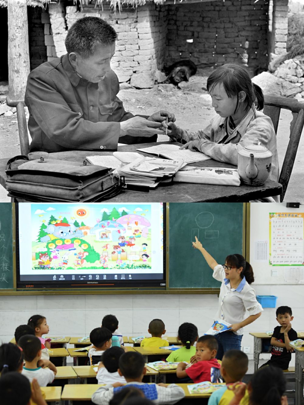 (上圖:1991年5月,金寨縣希望小學(xué)老師胡遵訓(xùn)跑20多里山路為學(xué)生胡亞麗補(bǔ)課,新華社記者張曙光攝;下圖:2019年9月3日,金寨縣希望小學(xué)南校區(qū)學(xué)生通過(guò)多媒體上課。新華社記者劉軍喜攝)