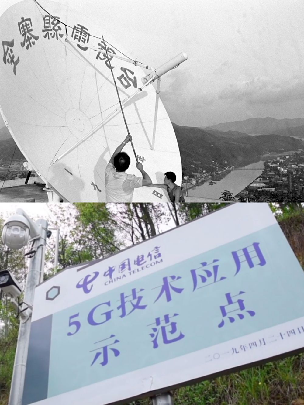 (上圖:1987年,金寨縣建成梅山地面衛(wèi)星接收站,新華社記者李錦攝;2019年,大灣村開通5G信號(hào)。新華社記者湯陽(yáng)攝)