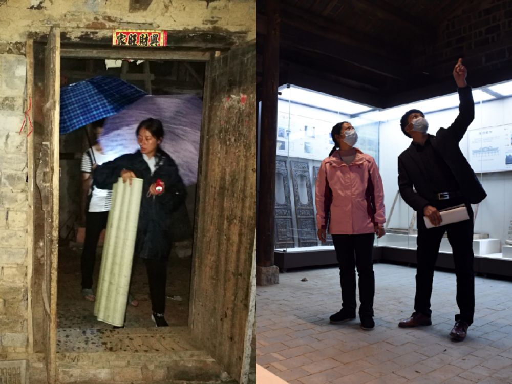 (左圖:2017年7月的一場(chǎng)大暴雨中,大灣村第一書記余靜轉(zhuǎn)移危房中群眾,新華社記者陳諾攝;右圖:2020年3月19日,大灣村在建農(nóng)俗博物館內(nèi),余靜(左)和施工人員交流。新華社發(fā)周牧攝)