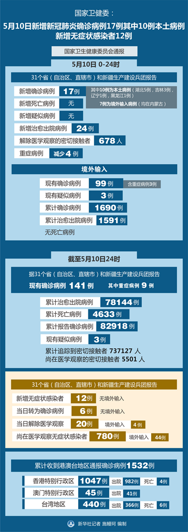 新華社北京5月11日電(記者屈婷)國(guó)家衛(wèi)生健康委員會(huì)11日通報(bào),5月10日0-24時(shí),31個(gè)省(自治區(qū)、直轄市)和新疆生產(chǎn)建設(shè)兵團(tuán)報(bào)告新增新冠肺炎確診病例17例,其中10例為本土病例(湖北5例,吉林3例,遼寧1例,黑龍江1例),7例為境外輸入病例(均在內(nèi)蒙古);無(wú)新增死亡病例;無(wú)新增疑似病例。