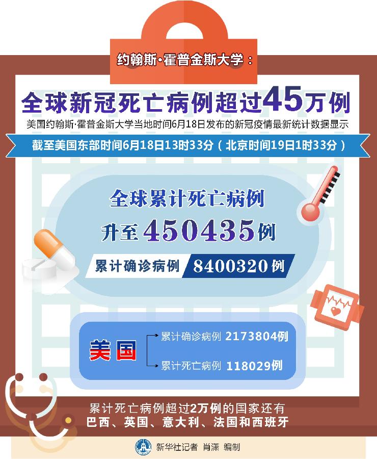 新華社紐約6月18日電 美國約翰斯·霍普金斯大學18日發布的新冠疫情最新統計數據顯示,全球累計死亡病例超過45萬例。