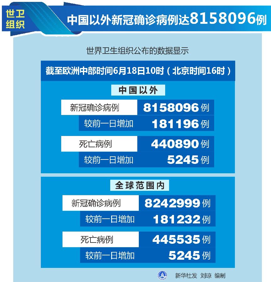 新華社日內瓦6月18日電(記者劉曲)世界衛(wèi)生組織18日公布的最新數(shù)據(jù)顯示,中國以外新冠確診病例達到8158096例。