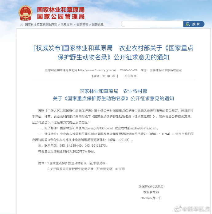 這些調(diào)整你同意嗎?公眾可通過以下途徑和方式提出反饋意見:一、電子郵件:國(guó)家林業(yè)和草原局dzwszgc@163.com;農(nóng)業(yè)農(nóng)村部ssbkw@cafs.ac.cn。二、通信地址:北京市東城區(qū)和平里東街18號(hào)國(guó)家林業(yè)和草原局動(dòng)植物司資規(guī)處(郵編:100714);北京市朝陽區(qū)農(nóng)展館南里11號(hào)農(nóng)業(yè)農(nóng)村部漁業(yè)漁政管理局資源環(huán)保處(郵編:100125)。三、聯(lián)系電話:010-84238449;010-59193273。有關(guān)意見反饋截止時(shí)間為2020年7月19日。(記者胡璐)