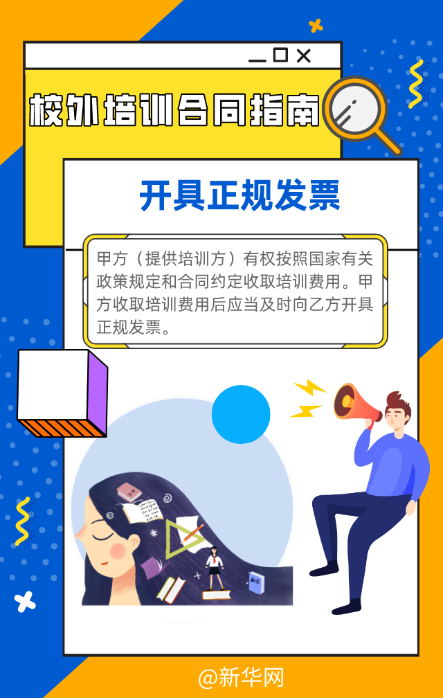 編輯: 盧俊宇 設計: 盧俊宇 2020年06月19日 10:54:51 來源: 新華網長期以來,校外培訓機構的資質問題,以及部分培訓機構存在違規收費、退費難、卷款“跑路”現象,這些令學生和家長發愁。教育部、市場監管總局近日發布《中小學生校外培訓服務合同(示范文本)》,供培訓者(學員)監護人與開展中小學生校外培訓的培訓機構簽訂培訓合同時參照使用,為規范校外培訓做出新的探索。一起來看看,這份“國家版”標準合同有哪些亮點?