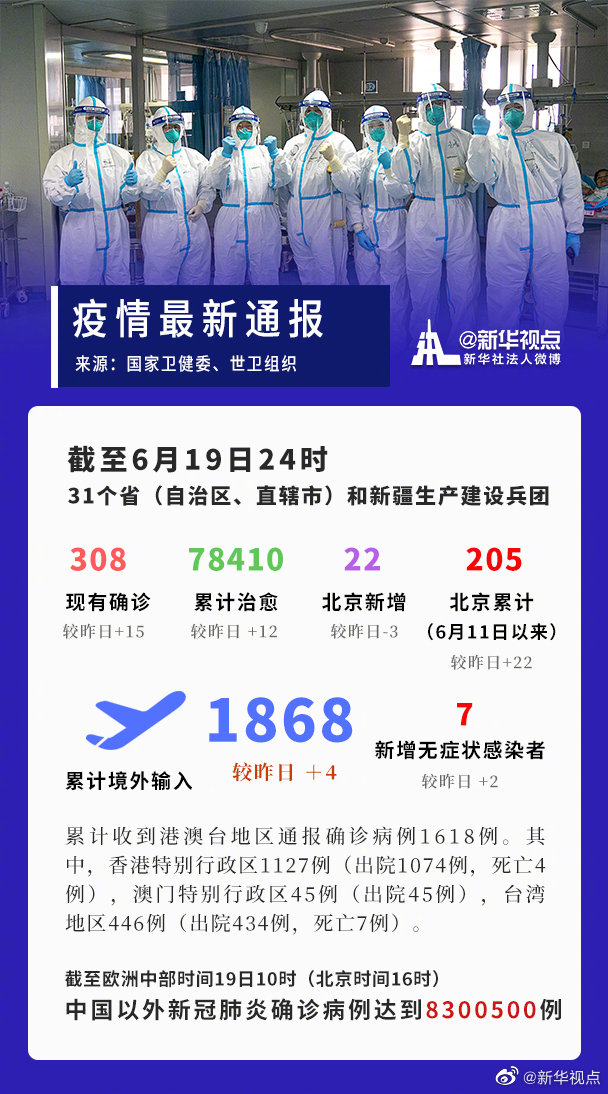 截至6月19日24時(shí),據(jù)31個(gè)省(自治區(qū)、直轄市)和新疆生產(chǎn)建設(shè)兵團(tuán)報(bào)告,現(xiàn)有確診病例308例(其中重癥病例13例),累計(jì)治愈出院病例78410例,累計(jì)死亡病例4634例,累計(jì)報(bào)告確診病例83352例,現(xiàn)有疑似病例11例。累計(jì)追蹤到密切接觸者756223人,尚在醫(yī)學(xué)觀察的密切接觸者6023人。