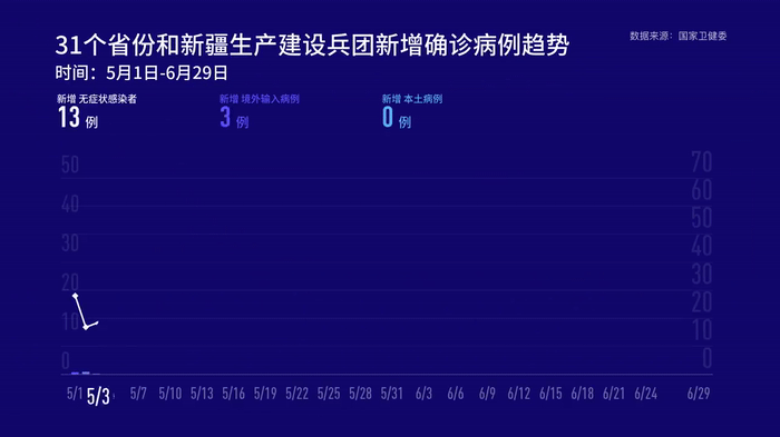 6月29日0—24時,31個省(自治區(qū)、直轄市)和新疆生產(chǎn)建設(shè)兵團(tuán)報(bào)告新增確診病例19例,其中境外輸入病例11例(廣東4例,上海3例,四川3例,甘肅1例),本土病例8例(北京7例,上海1例);無新增死亡病例;新增疑似病例1例,為境外輸入病例(在上海)。