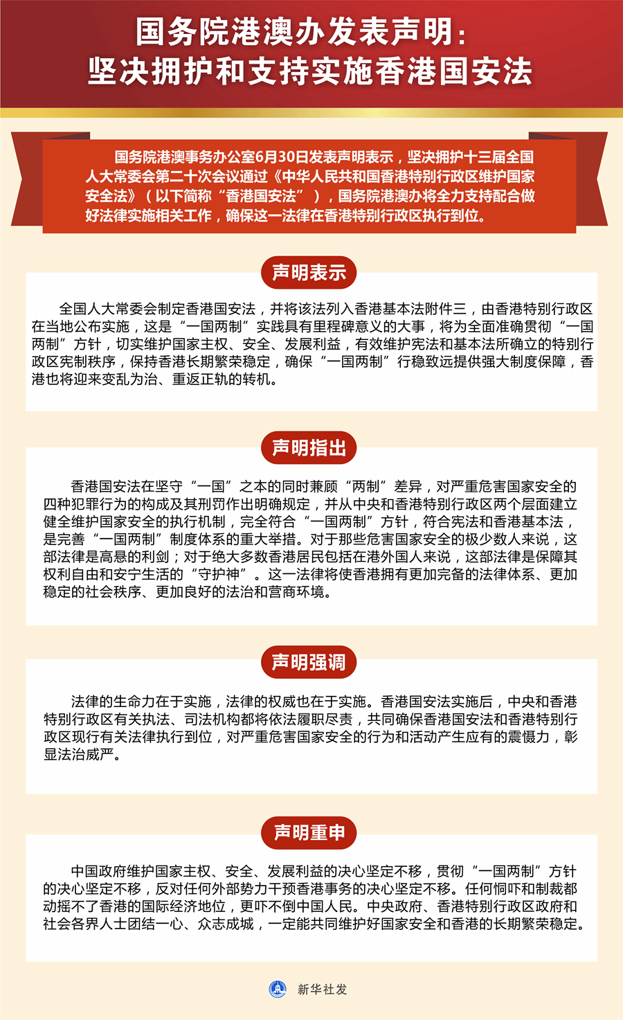 新華社北京6月30日電 國務(wù)院港澳事務(wù)辦公室30日發(fā)表聲明表示,堅(jiān)決擁護(hù)十三屆全國人大常委會(huì)第二十次會(huì)議通過《中華人民共和國香港特別行政區(qū)維護(hù)國家安全法》(以下簡(jiǎn)稱“香港國安法”),國務(wù)院港澳辦將全力支持配合做好法律實(shí)施相關(guān)工作,確保這一法律在香港特別行政區(qū)執(zhí)行到位。