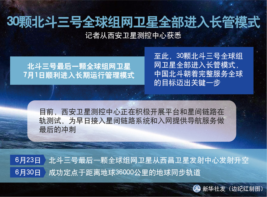 新華社西安7月1日電(李國(guó)利、徐新芳)記者從西安衛(wèi)星測(cè)控中心獲悉,北斗三號(hào)最后一顆全球組網(wǎng)衛(wèi)星1日順利進(jìn)入長(zhǎng)期運(yùn)行管理模式,至此,30顆北斗三號(hào)全球組網(wǎng)衛(wèi)星全部進(jìn)入長(zhǎng)管模式,中國(guó)北斗朝著完整服務(wù)全球的目標(biāo)邁出關(guān)鍵一步。
