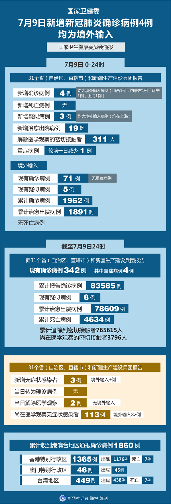 截至7月9日24時,據31個省(自治區、直轄市)和新疆生產建設兵團報告,現有確診病例342例(其中重癥病例4例),累計治愈出院病例78609例,累計死亡病例4634例,累計報告確診病例83585例,現有疑似病例8例。累計追蹤到密切接觸者765615人,尚在醫學觀察的密切接觸者3796人。