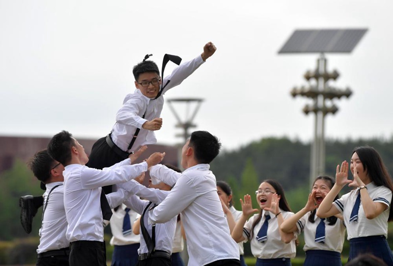 在南昌大學校園內,學子們一起歡呼,拍畢業照留念(6月10日攝)。新華社記者彭昭之攝