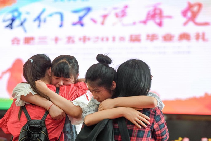 6月9日,合肥市第三十五中學的高三畢業生在畢業典禮上與老師擁抱。新華社記者張端攝