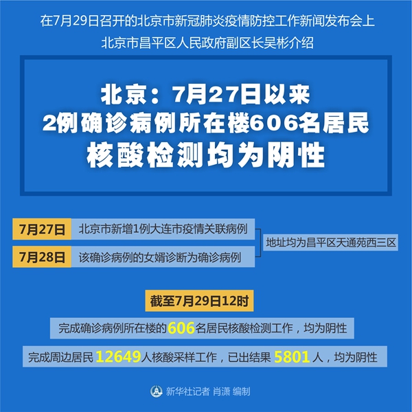 新華社北京7月29日電(記者陳旭)在29日召開的北京市新冠肺炎疫情防控工作新聞發布會上,北京市昌平區人民政府副區長吳彬介紹,27日以來2例大連市疫情關聯確診病例所在樓606名居民核酸檢測工作已完成,均為陰性。周邊居民12649人核酸采樣工作已出結果5801人,均為陰性。