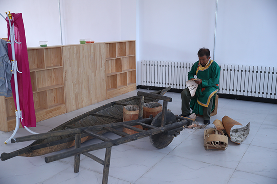在獵民村手工藝工坊記者見到年輕時打過獵、扎過撮羅子(狩獵和游牧民族的一種圓錐形“房子”)的那春林,他正在用樺樹皮制作蟈蟈籠子。鄂溫克人會在籠子里放上蟈蟈,把蟈蟈當作魚餌帶到阿倫河釣細鱗魚。他身旁的樺樹皮船、儲物筒、刀具配件都是用樺樹皮制作的。那春林說今年已接到一批展品訂單,預計可以收入4萬塊錢,家里流轉的土地還可以為他帶來3萬多元收入。