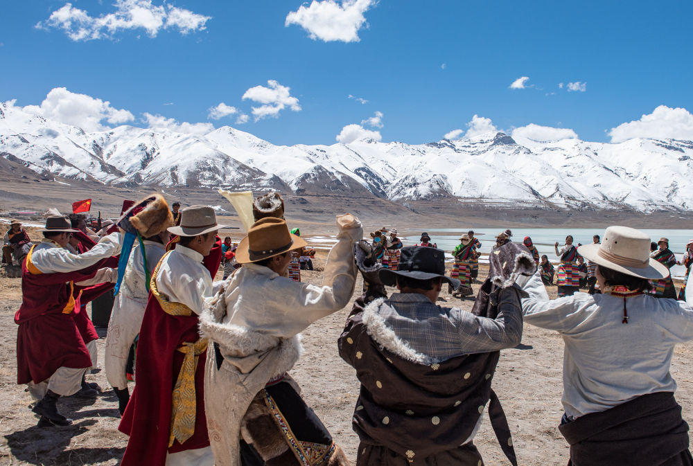 雪域高原上,村民們在春耕典禮上跳鍋莊舞(4月30日攝)。新華社記者 田金文 攝
