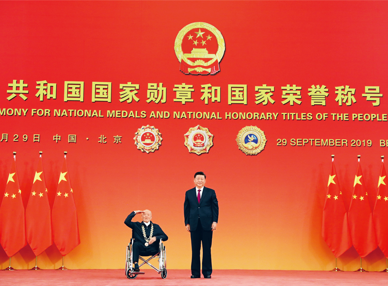 2019年9月29日,中華人民共和國國家勛章和國家榮譽稱號頒授儀式在北京人民大會堂金色大廳隆重舉行。中共中央總書記、國家主席、中央軍委主席習近平向“共和國勛章”獲得者張富清頒授勛章。 新華社記者 王曄/攝
