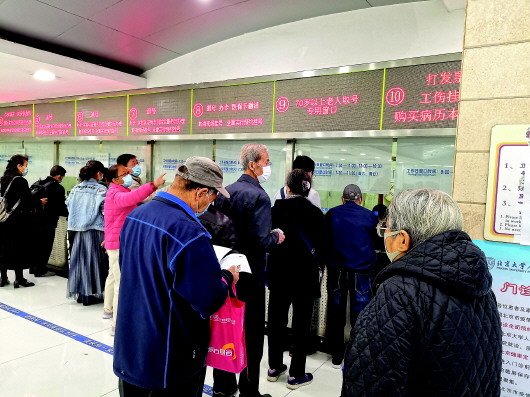 此時,這家醫院唯一一個現場掛號的窗口——面向70周歲以上老年人的窗口,已經排起了長隊。老人們一個比一個來得早,仍有點兒神色緊張。