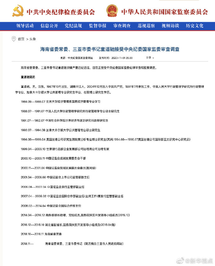 海南省委常委、三亞市委書記童道馳涉嫌嚴重違紀違法,目前正接受中央紀委國家監委紀律審查和監察調查。
