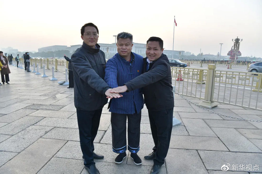 11月6日,十八洞村三任扶貧工作隊長龍秀林(中)、石登高(左一)、麻輝煌(右一)觀看升國旗儀式后同國旗合影 新華社記者李賀 攝