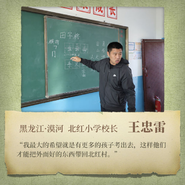 這所位于黑龍江省漠河市北極鎮(zhèn)北紅村的北紅小學(xué)只有兩位老師、3個(gè)年級(jí)和11名學(xué)生。“80后”校長(zhǎng)王忠雷每天在數(shù)學(xué)、體育、思想品德三個(gè)科目中“周旋”。打開(kāi)課件,他向?qū)W生熟練講授“體積與容積”相關(guān)知識(shí)的時(shí)候,隔壁教室傳來(lái)妻子于晶的語(yǔ)文課上孩子們瑯瑯的讀書(shū)聲……