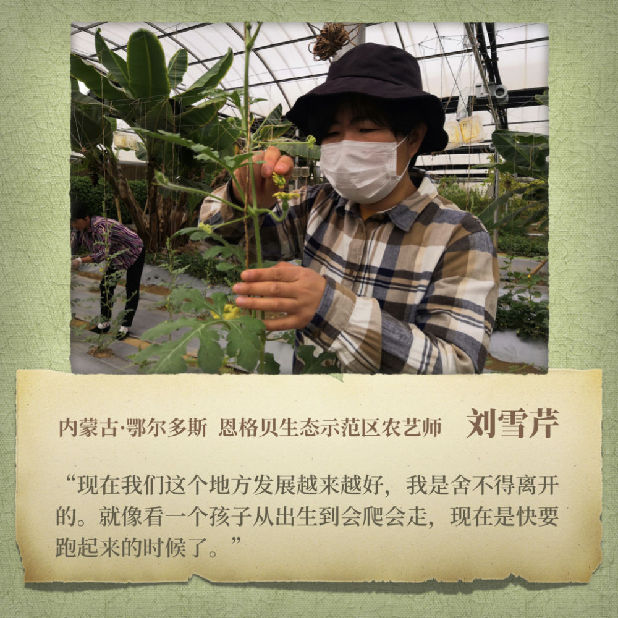 2009年初,大學(xué)畢業(yè)剛半年的劉雪芹來(lái)到恩格貝。彼時(shí),面對(duì)有技術(shù)門(mén)檻的設(shè)施農(nóng)業(yè),當(dāng)?shù)貛缀鯖](méi)有熟練工人,種植、育苗都需要?jiǎng)⒀┣凼职咽纸獭2輼I(yè)科學(xué)專(zhuān)業(yè)畢業(yè)的劉雪芹克服著環(huán)境、氣候等困難,同時(shí)也懂得借助自然的力量。