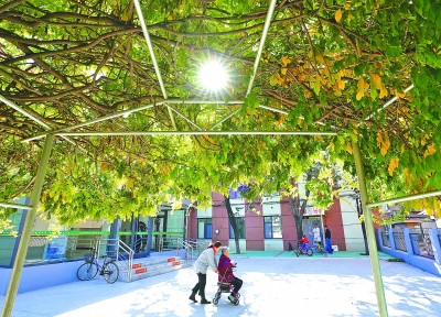 河北唐山市路北區煤研分院社區幸福家園養老服務中心,工作人員陪護一位老人在院內活動。新華社發