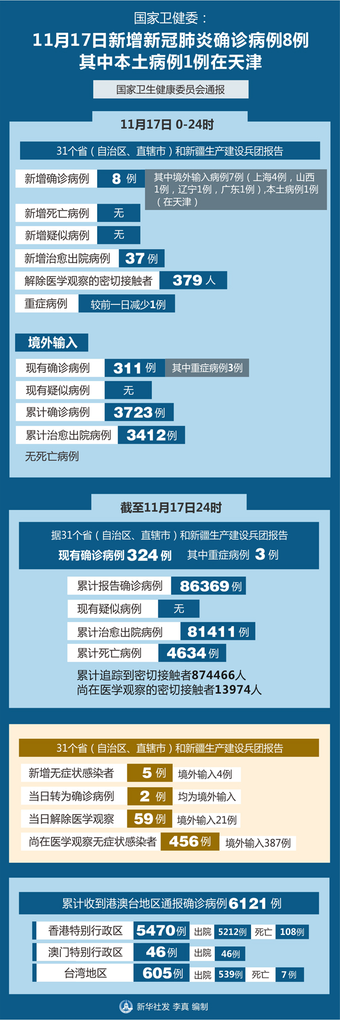 新華社北京11月18日電 國家衛生健康委員會18日通報,11月17日0-24時,31個省(自治區、直轄市)和新疆生產建設兵團報告新增新冠肺炎確診病例8例,其中境外輸入病例7例(上海4例,山西1例,遼寧1例,廣東1例),本土病例1例(在天津);無新增死亡病例;無新增疑似病例。