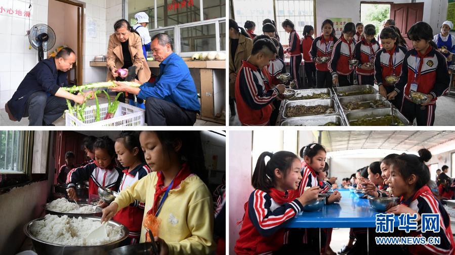 這是一張拼版照片。上左:在融水苗族自治縣東陽村小學,廚房師傅們在準備營養午餐;上右:東陽村小學學生根據需要挑選菜肴。下左:東陽村小學學生排隊打飯;下右:東陽村小學學生在食用營養午餐。近年來,廣西在貧困地區大力推行學生營養餐,幫助貧困學生健康成長(2019年5月6日攝)。新華社記者 張愛林 攝