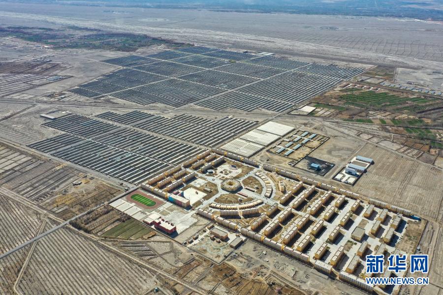 這是新疆阿克陶縣易地扶貧搬遷點的阿克陶縣現代設施農業產業扶貧基地和阿克陶縣昆侖佳苑小區(3月22日攝,無人機照片)。新華社記者 丁磊 攝