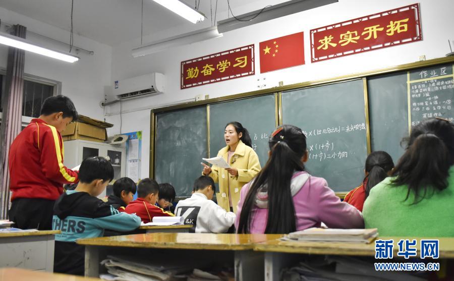 11月17日晚,在河南省洛陽市嵩縣德亭鎮酒店小學,王予川給寄宿小學生輔導功課。新華社記者 韓朝陽 攝