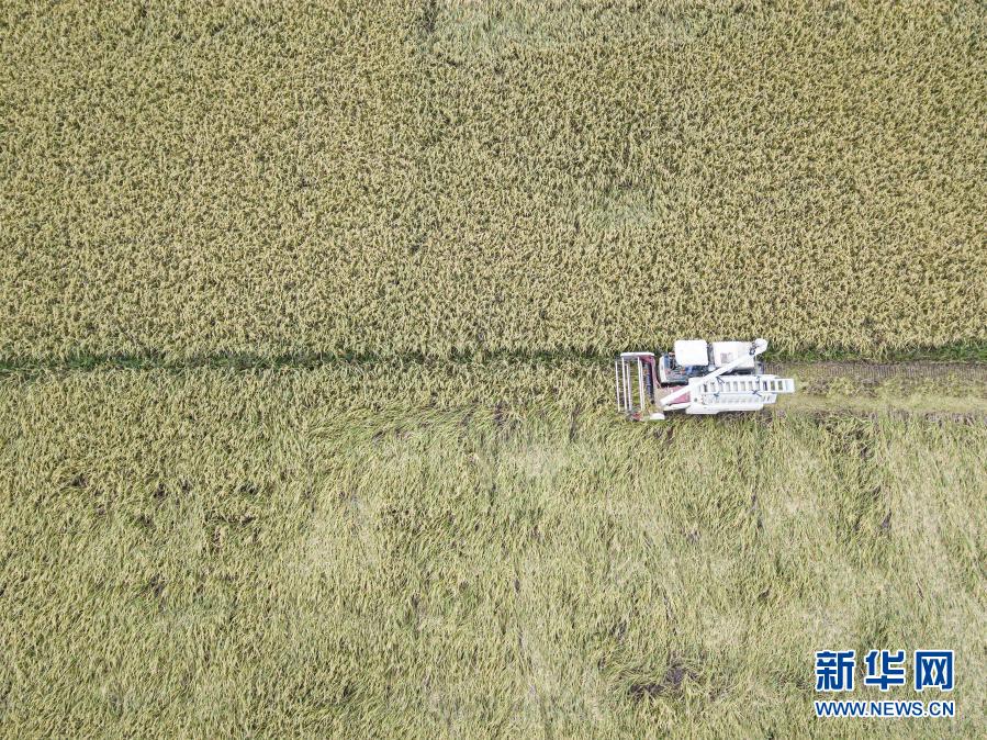 10月22日,工作人員駕駛收割機在海南??邶埲A區龍泉鎮新江村收割晚稻(無人機照片)。