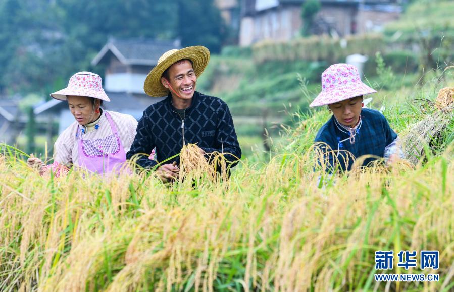 貴州省從江縣加榜鄉(xiāng)加車村的農民在收割水稻(9月19日攝)。
