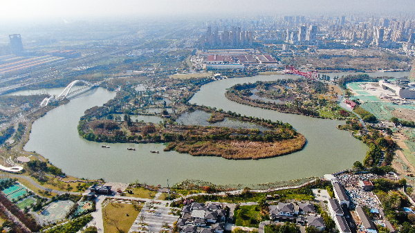 這是11月14日拍攝的江蘇省揚(yáng)州市運(yùn)河三灣生態(tài)文化公園景色(無人機(jī)照片)。新華社記者 季春鵬 攝