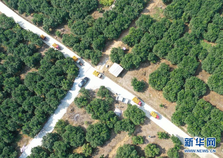 在廣西羅城仫佬族自治縣金玉柚生態產業扶貧示范區,裝載柚子的車輛在柚子園內行駛(無人機照片,2019年11月5日攝)。新華社記者 陸波岸 攝